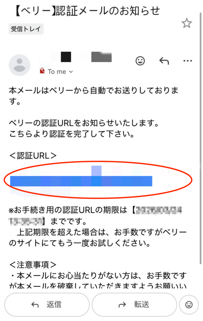 入力後、「認証メールを送る」を押すとベリー運営からメールが届きます。